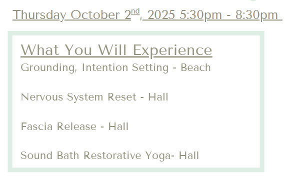 consultations, I share 15+ years of holistic training—blending Ayurvedic practices, lymphatic drainage, nervous system reset techniques, Reiki, Hatha yoga, and biohacking methods. My events are safe, judgment-free spaces where you’ll laugh, connect, and leave feeling renewed, empowered, and ready to thrive.